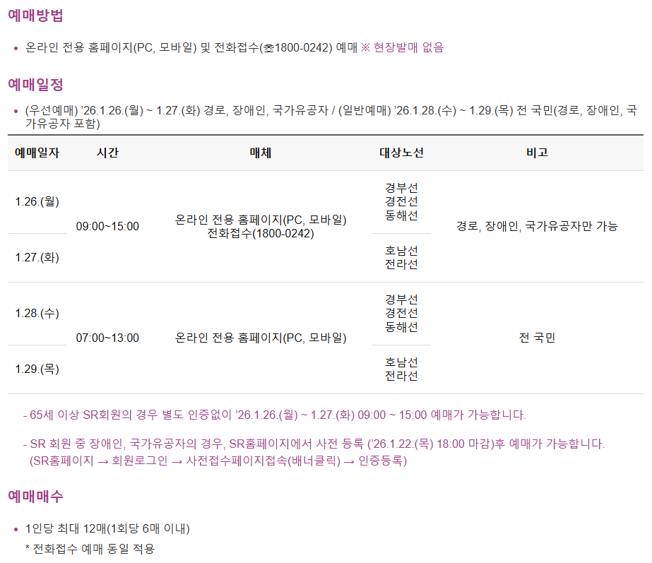 - ✔ SRT 예매: 1월 26일~29일